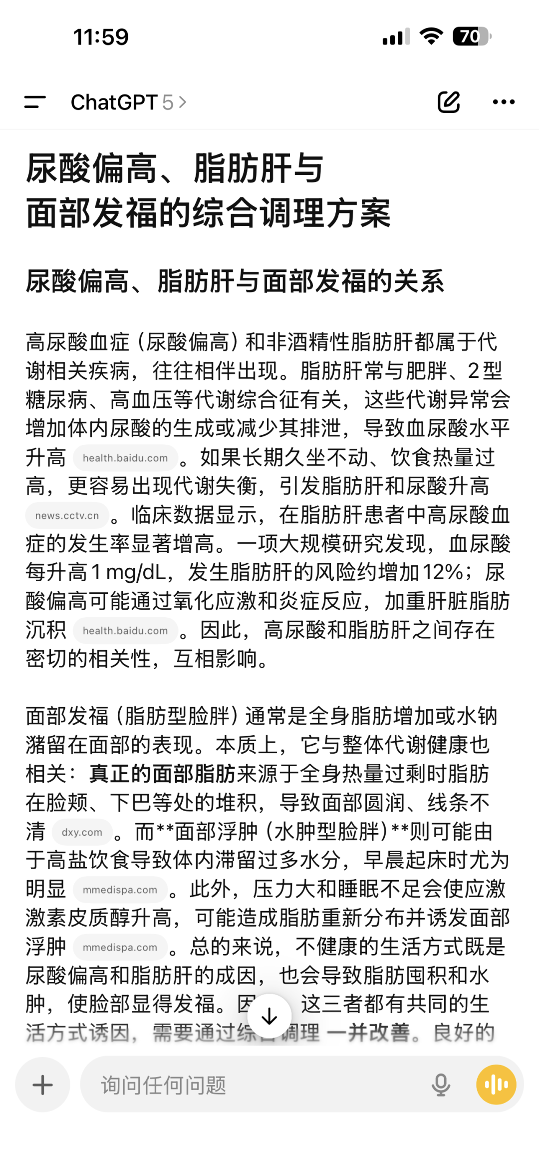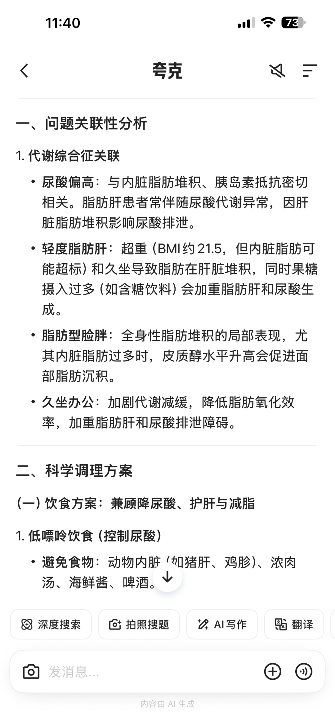 GPT只会把我“尿酸高”和“脂肪肝”当成两个孤立的问题来回答;而夸克则凭借其深厚的“健康大模型”知识库,一针见血地指出了两者共同的根源——“胰岛素抵抗”。