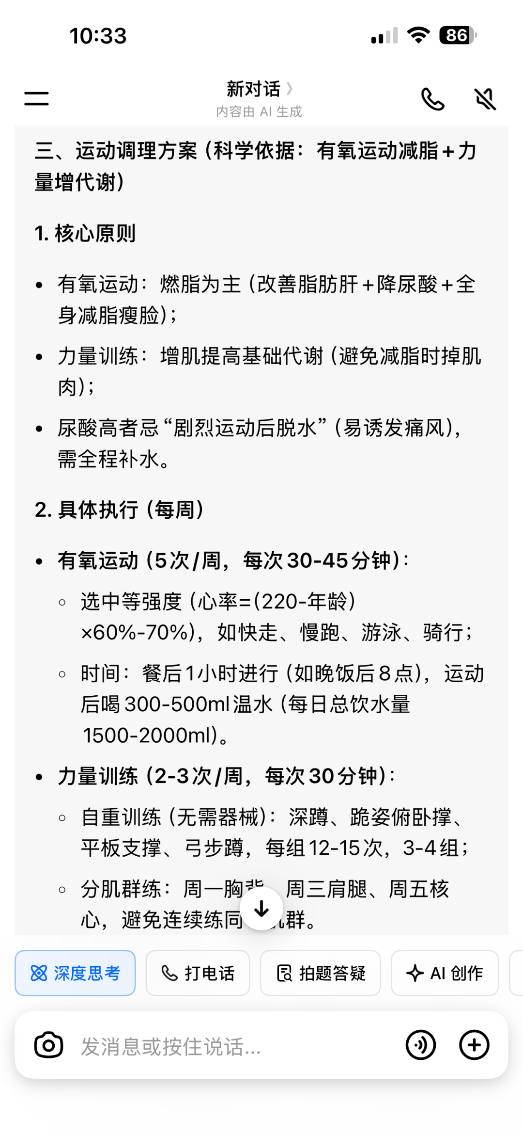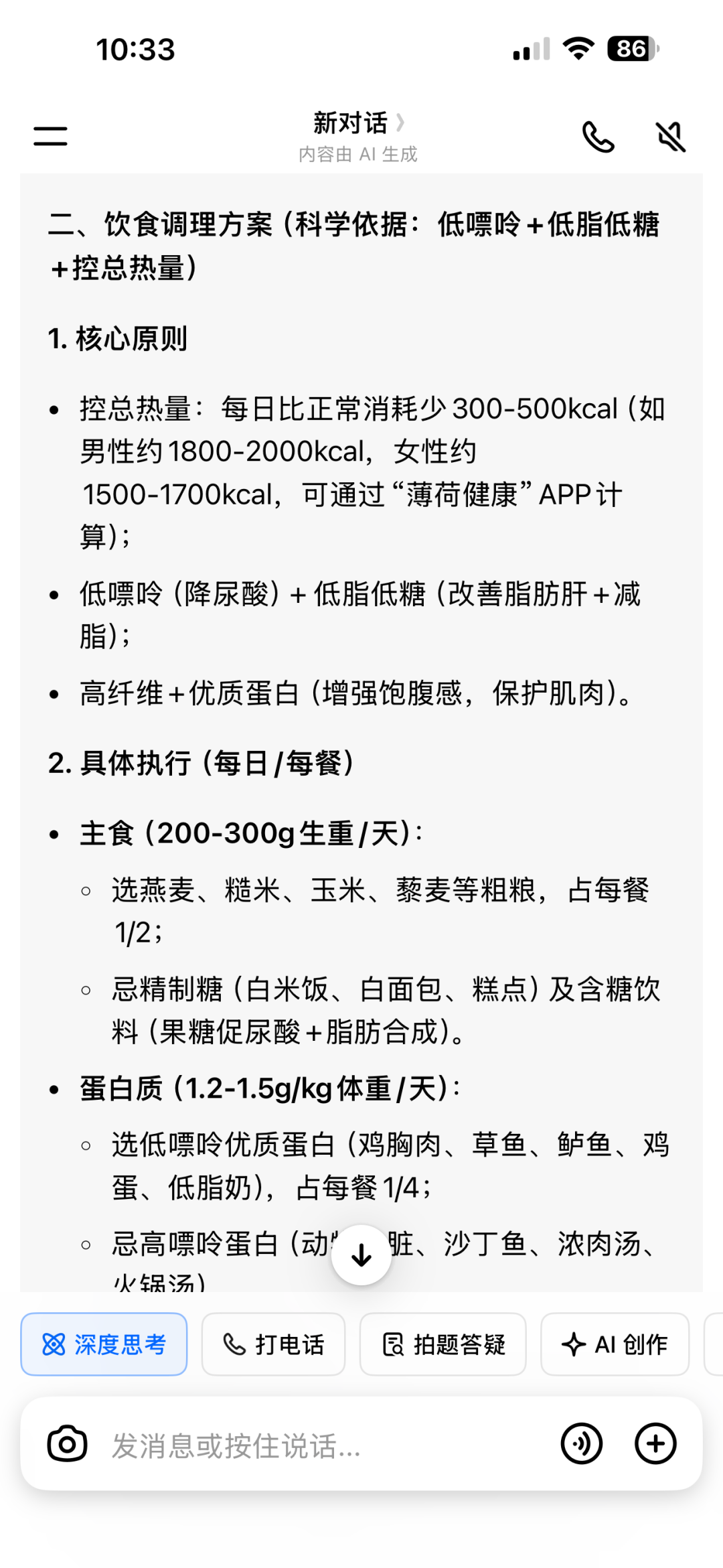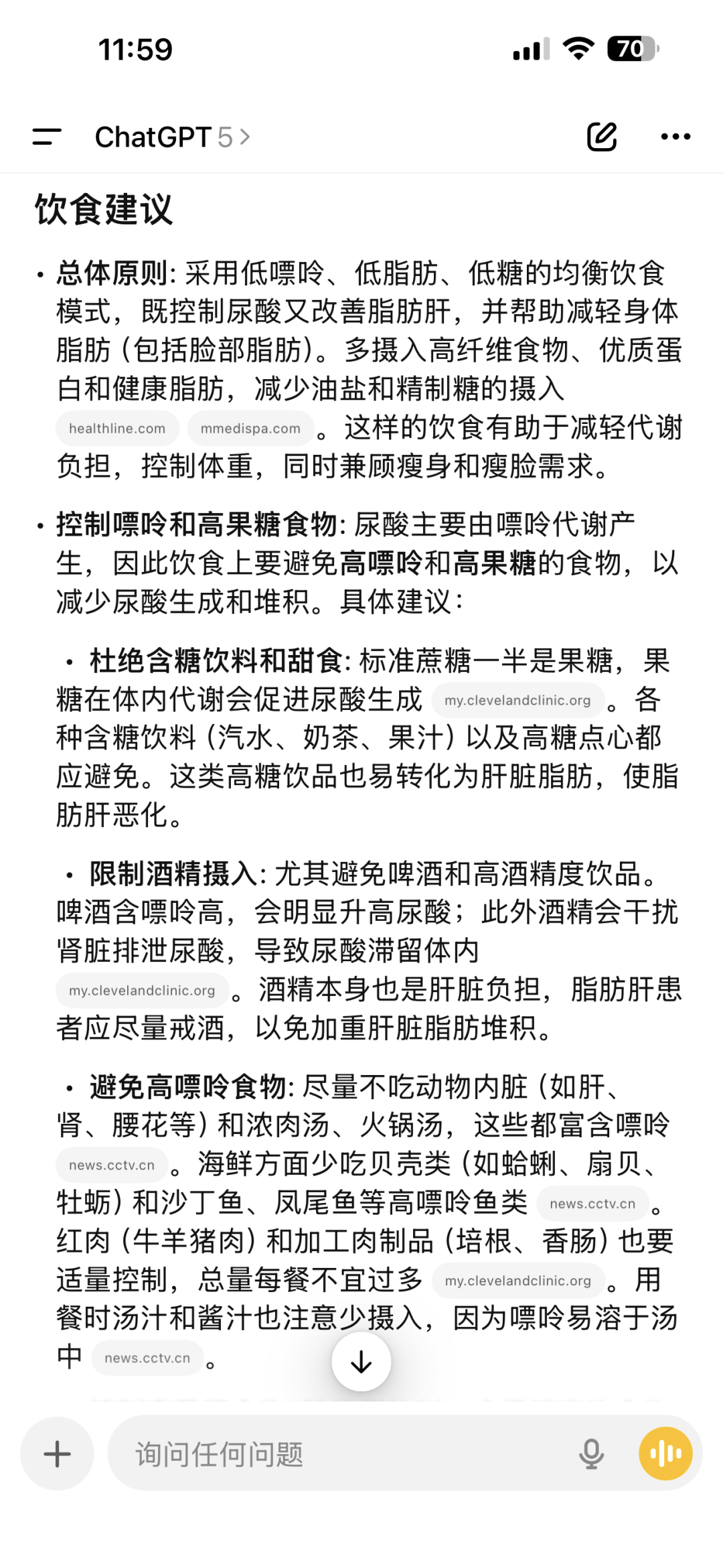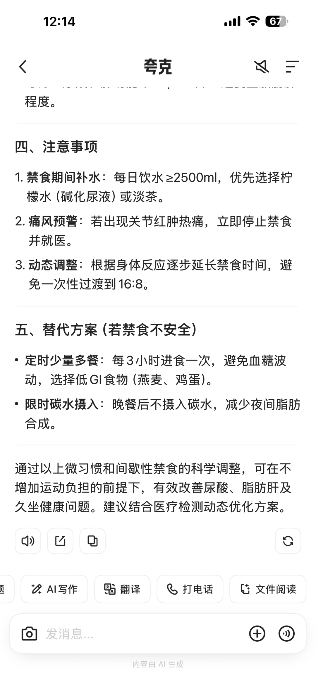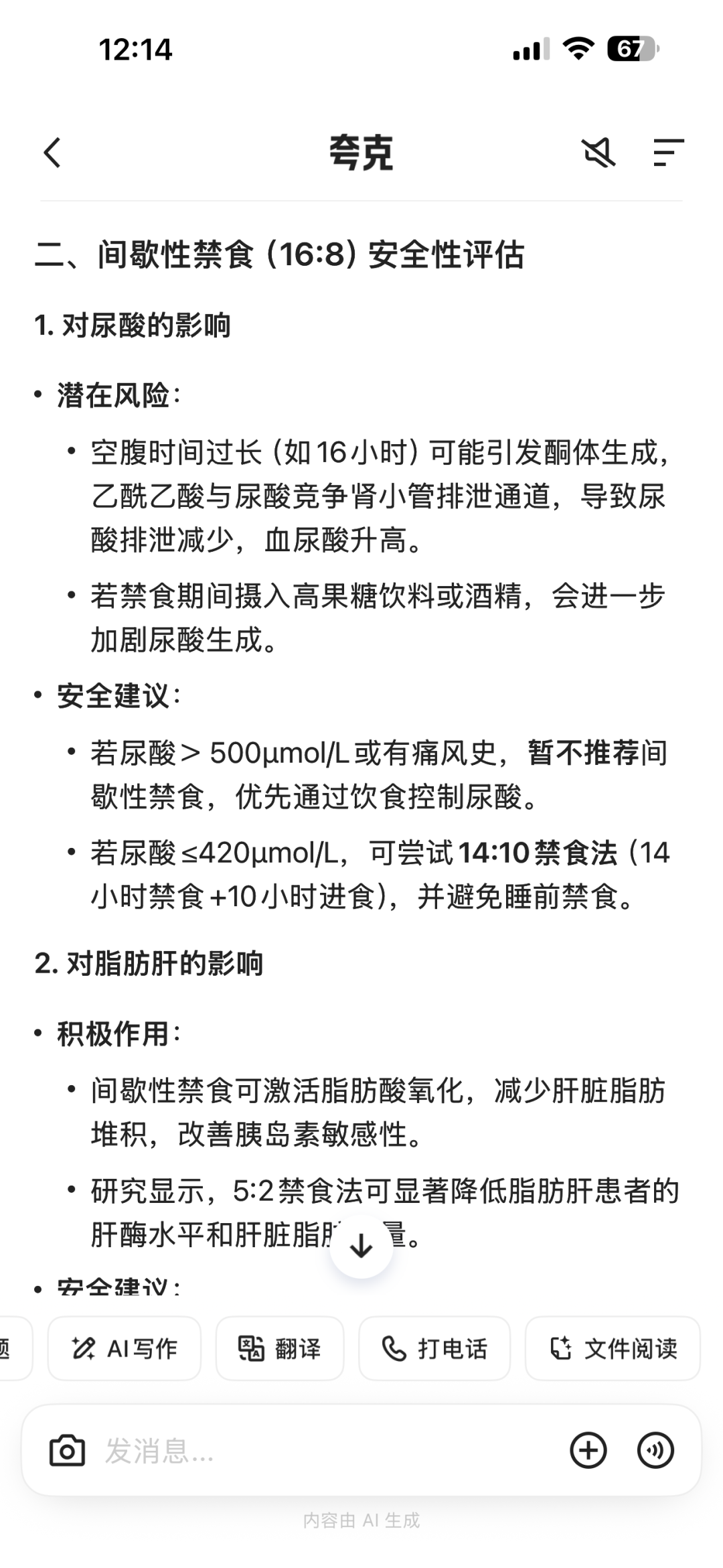 1.指出风险: 它明确警告我,禁食产生的“酮体”会与“尿酸”竞争排泄通道,可能导致血尿酸升高。这是一个救命的专业建议!