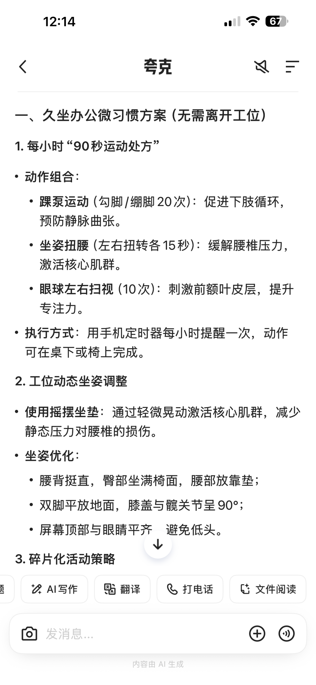 Prompt : “这个方案很专业。但我久坐,很难执行。请你结合我“日常久坐办公”的特点,给我一个非运动时间的“微习惯”调整方案,并且帮我查一下‘间歇性禁食’(比如16:8)对我的情况(尿酸和脂肪肝)是否安全?”