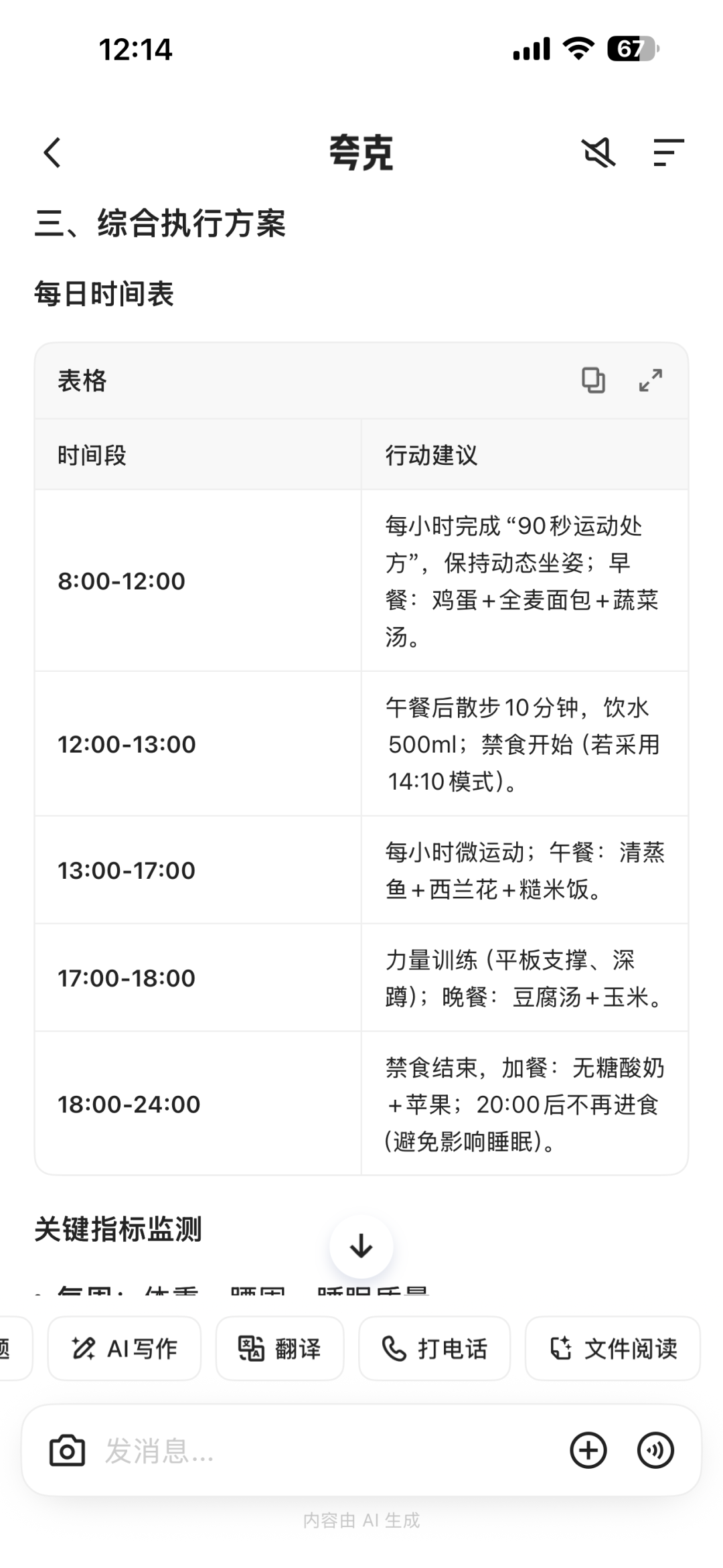 3.给出方案: 它没有一刀切,而是给出了“安全建议”(如先尝试14:10)和“替代方案”(如定时多餐)。
