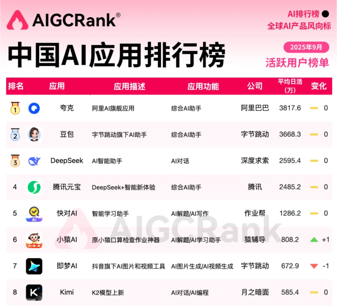 根据AIGRank在9月的《中国AI应用排行榜》,夸克的平均日活领跑市场。