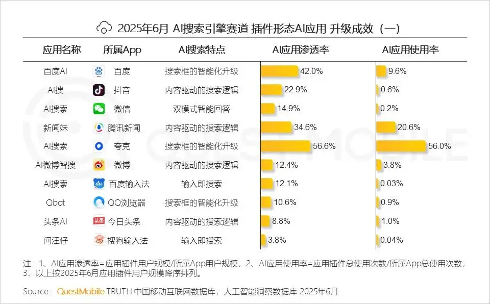 在QuestMobile的《2025年AI应用市场半年报》中,夸克AI搜索的渗透率和使用率双双领先,分别达到56.6%和56%: