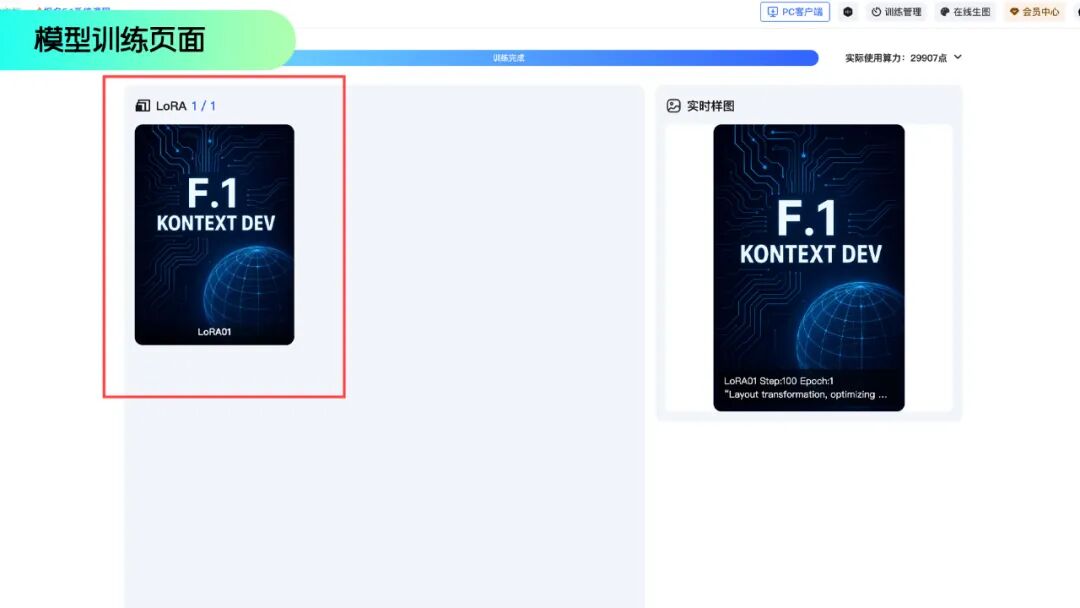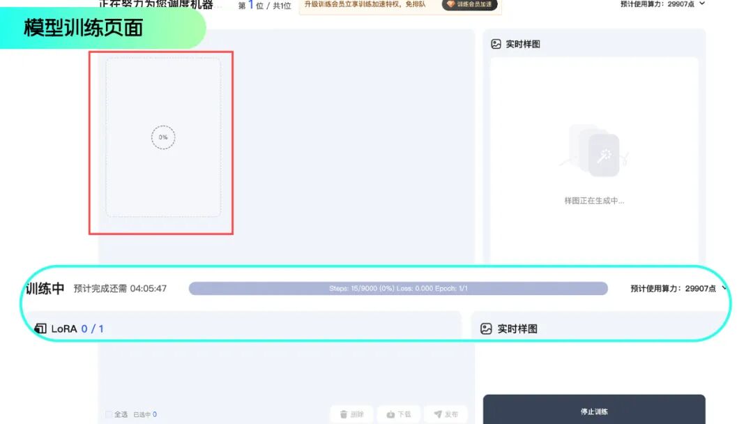 27组-6646点算力(2000步)-预计1-2个小时训练完成60组-29907点算力(9000步/150步每组)-预计3-5小时训练完成1000个算力约可生图1000张,或训练5次。按照生图默认参数、或训练基础参数预估(即训练图片张数20张*单张训练次数15*训练轮数10)