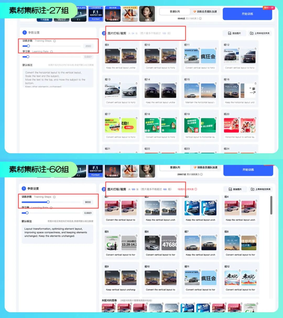 kontext lora模型训练方式:以组为单位(输入图像+输出图像),通过多组图片和文本文件(打标提示词),让模型多次琢磨每组图片的规律来形成特定能力(例如换脸、换装、换风格、换角度排版等),我们需要排版的能力正好可以满足。