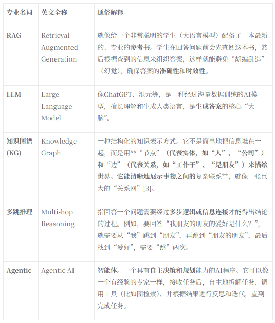 解决方案:采用Agentic GraphRAG。引入AI Agent,将GraphRAG作为一个可调用的工具集成到Agent框架中。Agent通过自主规划迭代推理,指导图检索过程,显著提高了复杂问答场景下的准确性可解释性[5, 10]。