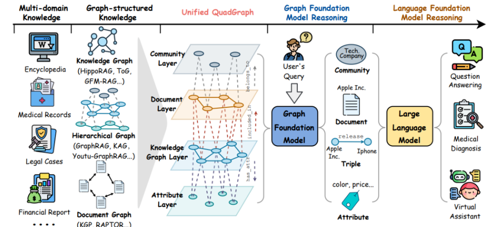 QuadGraph可以将不同来源的图结构(如知识图谱、文档图、层级图)统一为属性层、知识图谱层、文档层、社区层的标准化四层级图。也就是如果你有来自不同图结构的库,都可以通过QuadGraph集成在一起,这打破了图结构的壁垒,使LLM能够处理异构的图知识,大大扩大了知识的检索广度。