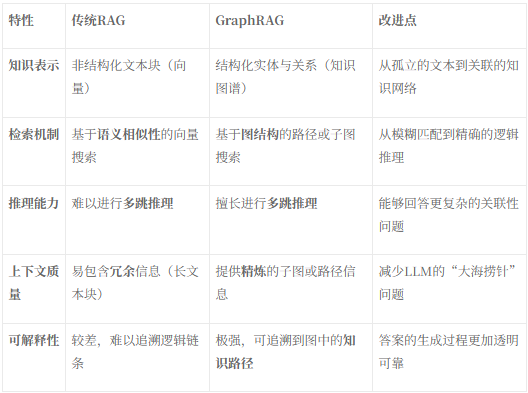 GraphRAG通过引入图结构化知识,对传统RAG进行了本质上的改进,尤其体现在处理复杂查询和提高可解释性方面 [3]: