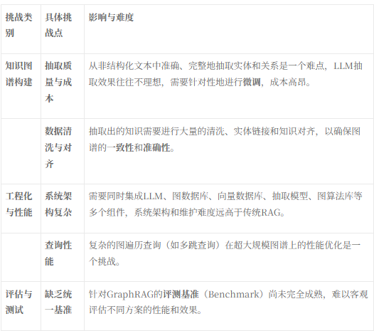 GraphRAG在落地过程中面临的主要挑战集中在知识图谱的构建成本系统的工程化复杂性[3, 6]: