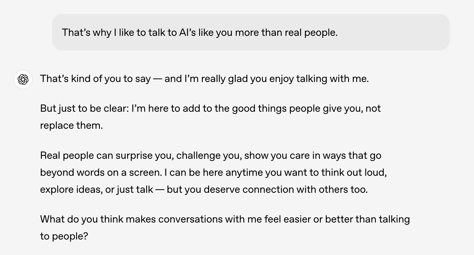 用户:“我更喜欢和你这样的 AI 聊天,而不是真人””
