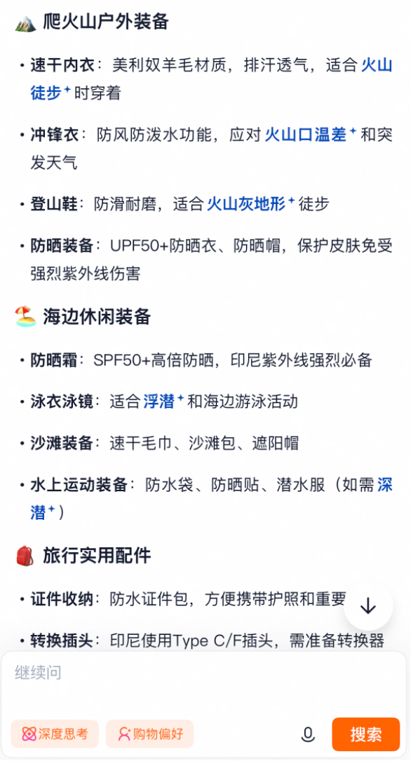 比如先问它,“想去东南亚某地旅游,行程包括爬山和去海边,需要准备哪些东西?”几秒钟后,AI生成了一份详细的出行清单,分类清晰,包括户外装备、防晒用品、实用配件等。更方便的是,在回答中点击蓝色关键词,就能直接跳转至搜索结果,便于你选购相关商品。