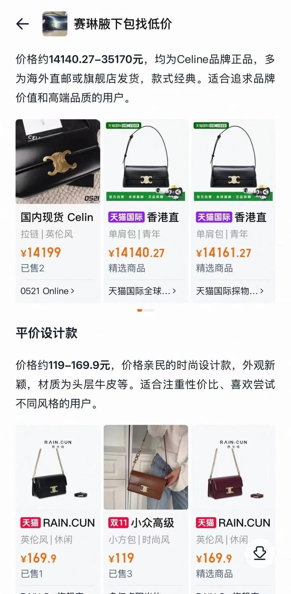 同时,系统也推荐了几款平价设计款包包,价格在119元至169元之间。对于预算有限、但在意风格相似度的用户来说,这种延伸推荐颇具参考价值。