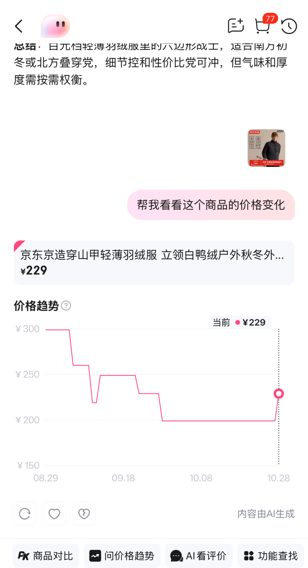 比如,它提供了两个很实用的功能:价格趋势和AI看评价。前者顾名思义,可以直观查看该商品在一段时间内的价格变化曲线;后者则通过自然语言分析消费者的评论内容,生成总结性意见。
