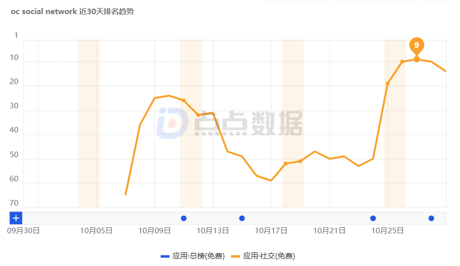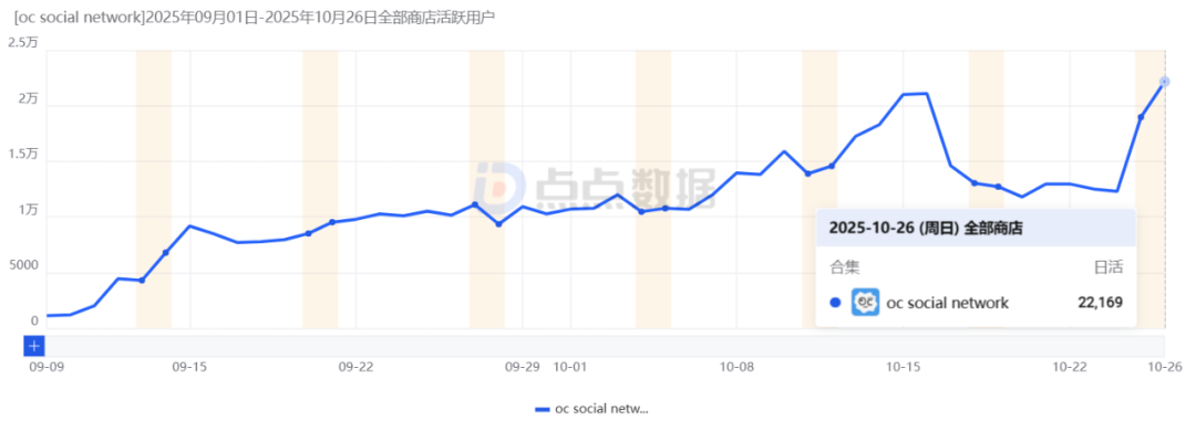 点点数据显示,oscn于2025年10月2日正式上线,10月27日登上美国Google Play应用社交榜第9位。截至10月26日,其在苹果与谷歌平台的累计下载量达到22万。
