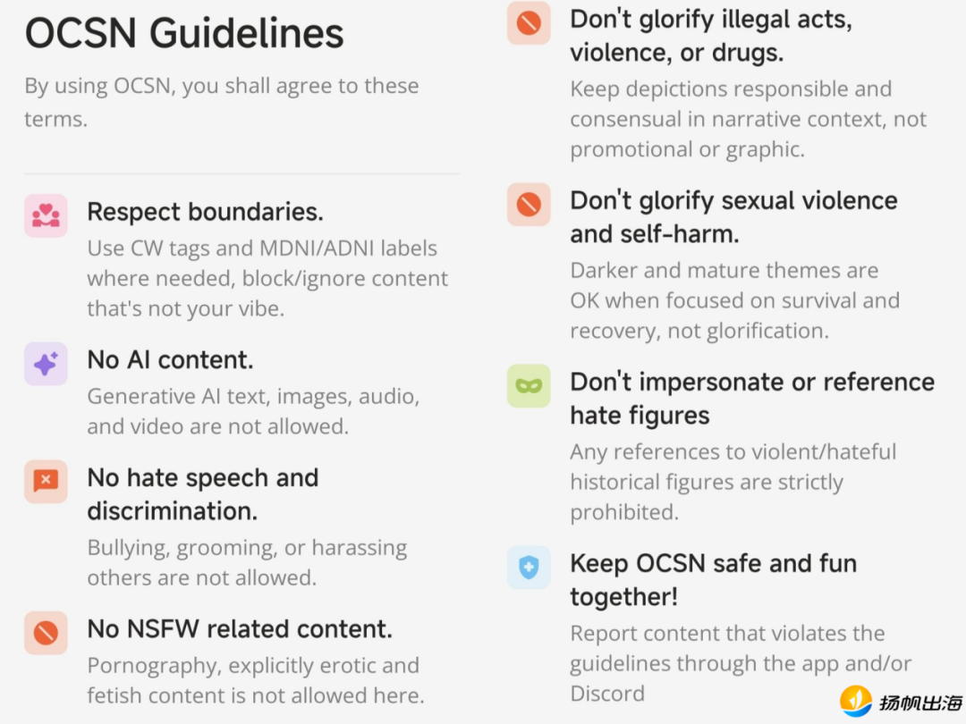 在用户正式开始使用前,oscn还特别强调了一些应用特性。例如,用户可以屏蔽不喜欢的标签(体现了“圈地自萌”的社区文化),同时应用明确禁止任何AI生成内容,确保平台上的内容都由真人提供。