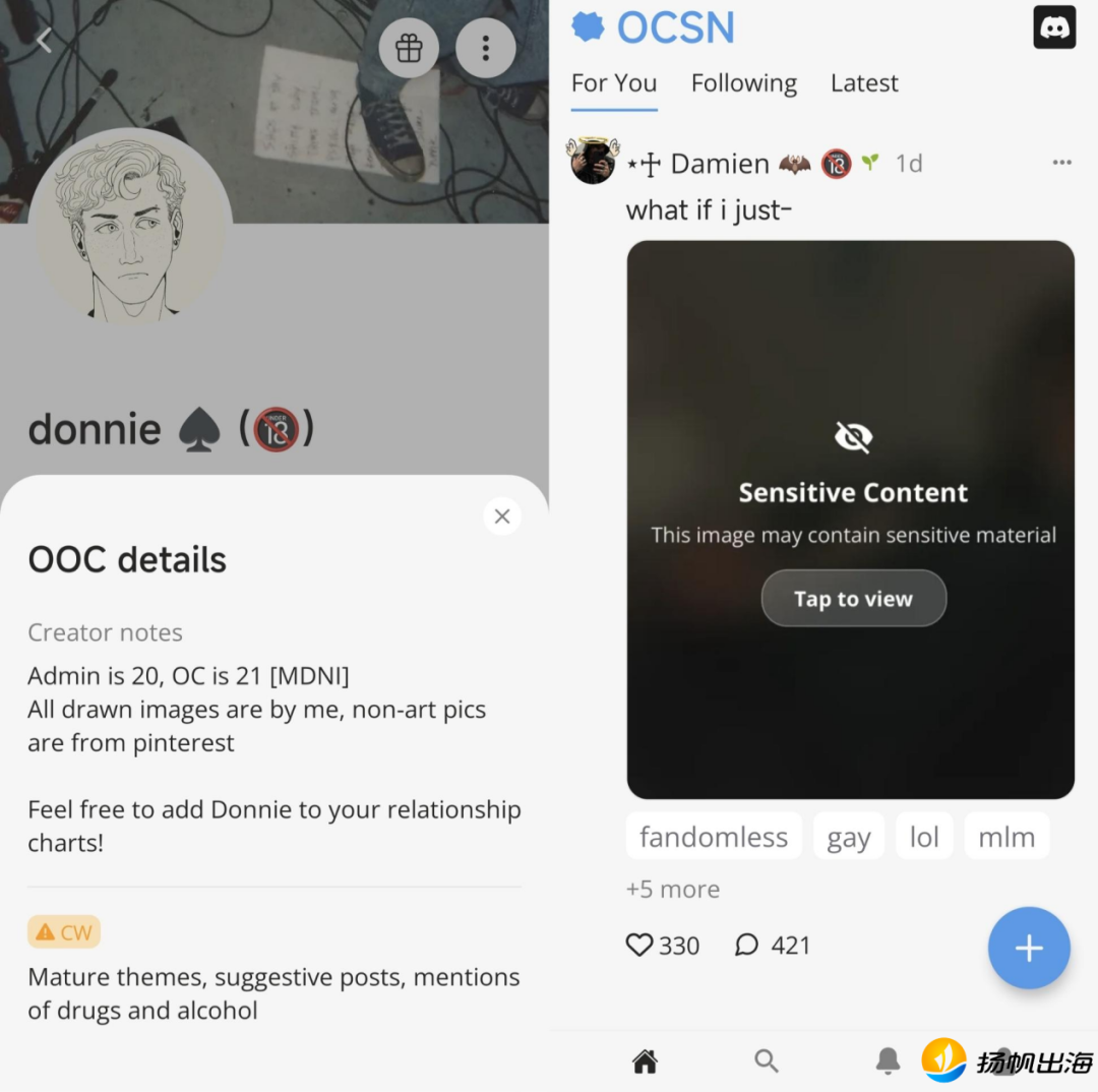 在内容合规性层面,oscn也进行了专门的设计。部分发布成人内容的OC昵称尾巴会打上相应的标签;用户在首页浏览帖子时,涉及暗黑或成人题材的图片也需要二次点击才能打开。此外,在搜索页中,用户可以看到当前的热门话题及对应的新成员数量,平台由此为用户制造社交共鸣点。
