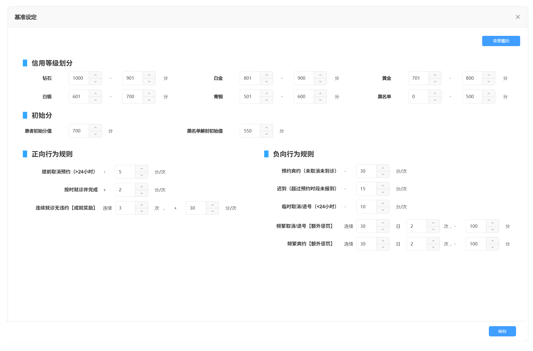 自动记录患者每一次就医行为对应的信用分变化,展示记录时间、行为事件、分数增减、信用分余额等信息,形成患者信用行为的全生命周期追溯,让管理者清晰掌握患者信用分数的变化原因。