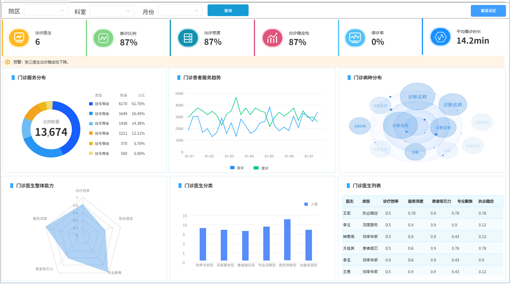 从工作效率、服务模式、职业稳定、专业能力四大维度,构建医生能力的量化分析指标体系,支持管理者按院区、科室、月份进行多维度查询,同时对医生出诊稳定性等关键指标进行实时预警。