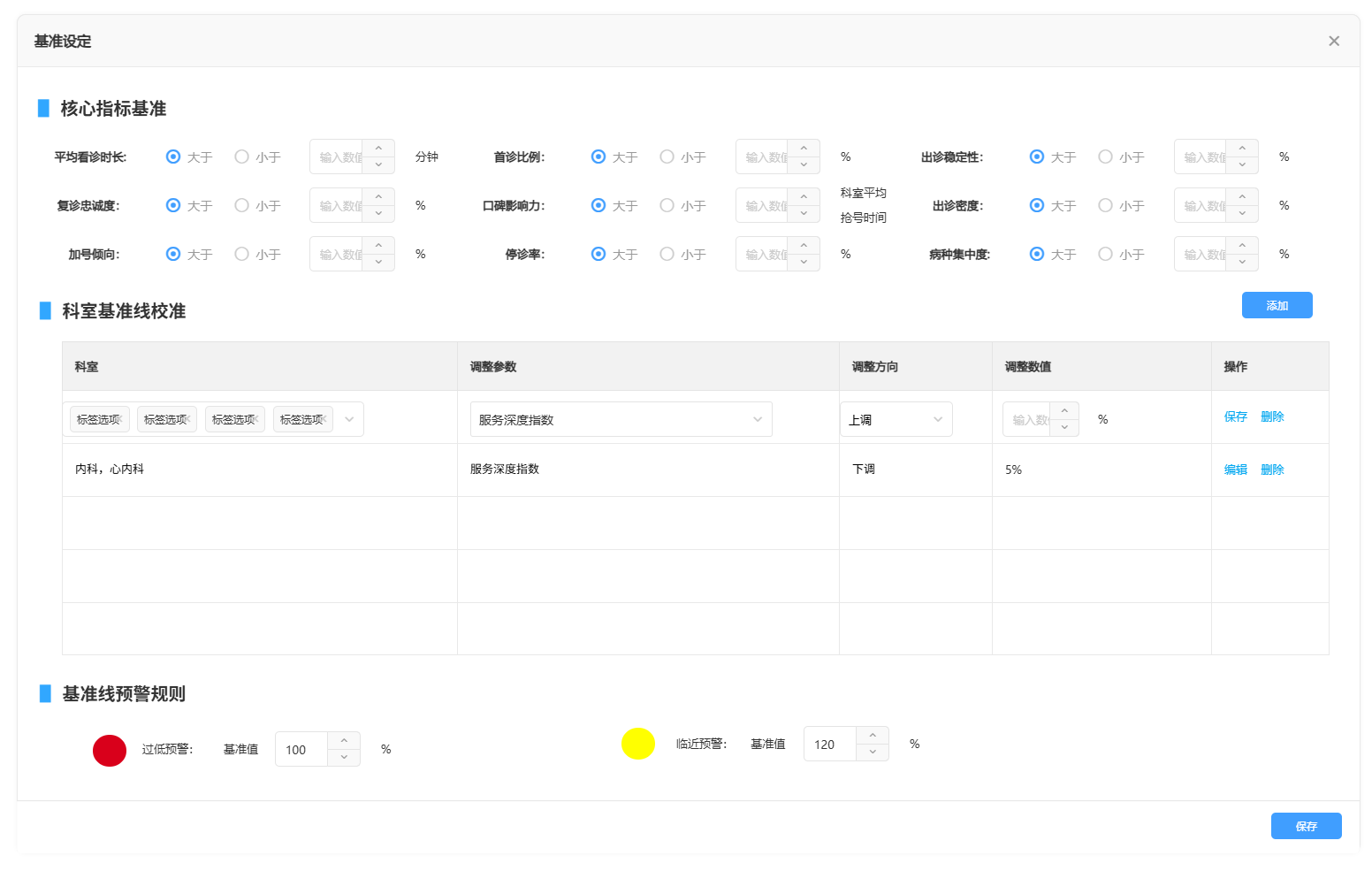 支持医院根据自身的运营特点、专科特色、管理需求,灵活调整医生能力各维度指标的基准值、评分规则、阈值划分,让医生能力评估更贴合医院的实际情况,避免 “一刀切” 的评估方式。