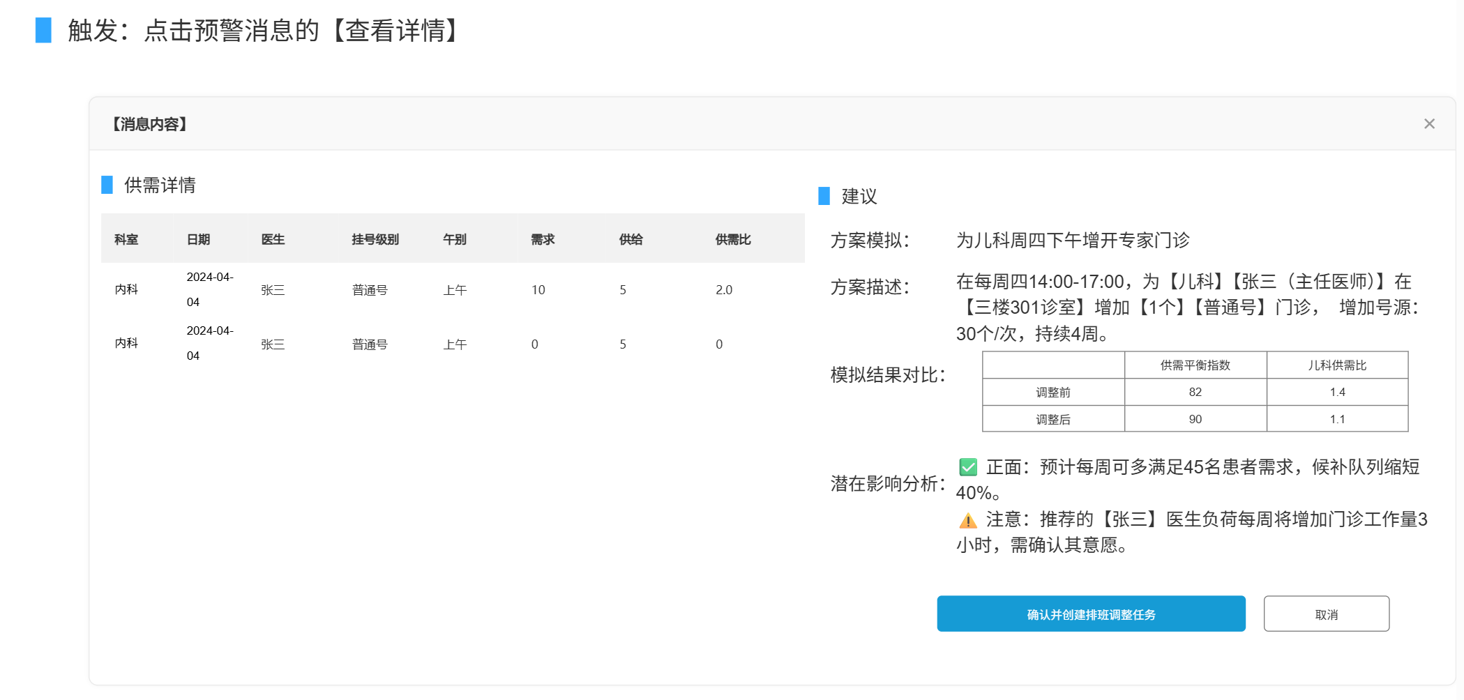 供需平衡分析模块以可视化图表的形式,展示周期供需趋势、资源供需耦合分析、候补队列效能评估、候补需求分布等核心内容,直观呈现各科室 / 医生 / 时段的供需变化;同时,针对供需比突破阈值、平衡指数进入黄灯 / 红灯区等情况,系统会自动发出预警,并结合数据分析结果给出针对性的决策建议(如调整医生排班、增加弹性加号、引导患者错峰就诊等),让管理者的决策有数据支撑、有方向可循。