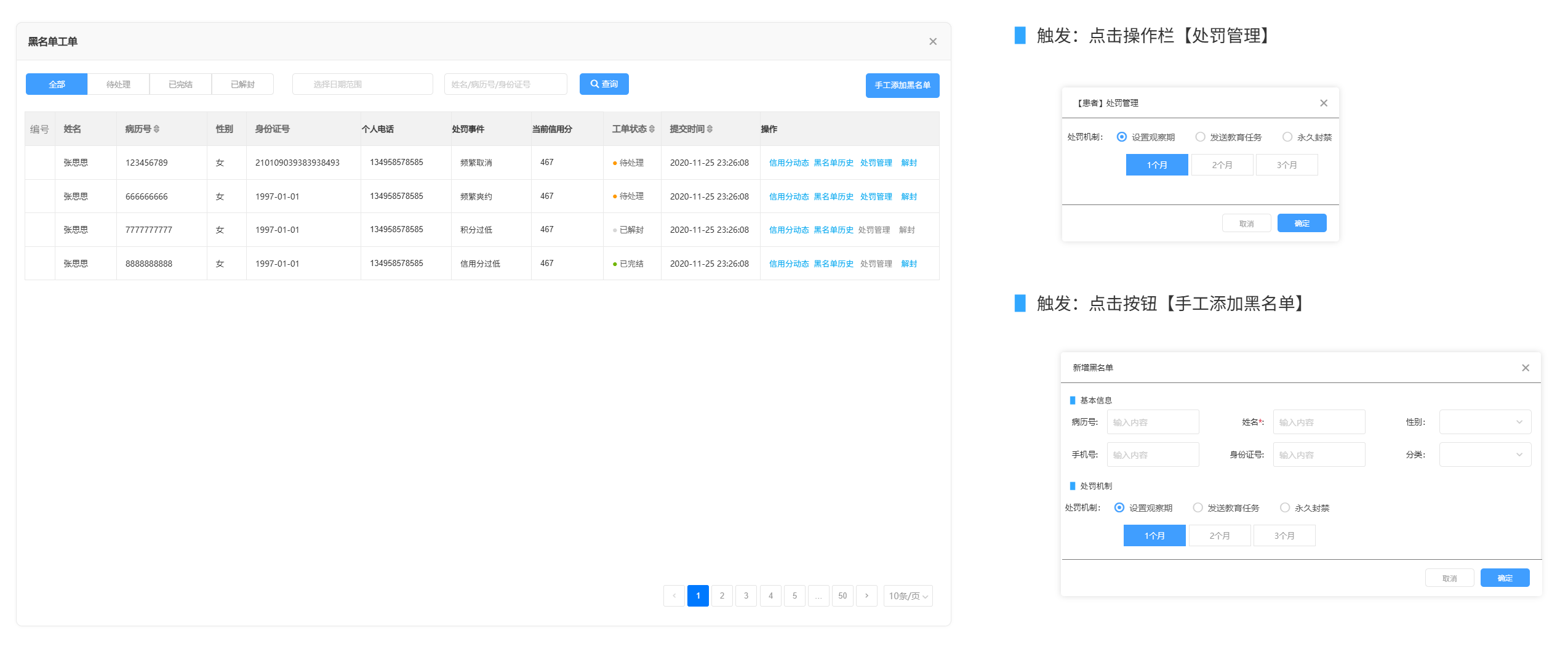 针对信用分过低或存在恶意就医行为的患者,建立全流程的黑名单管理机制,实现自动触发、人工审核、分级处罚、灵活解封的闭环管理。