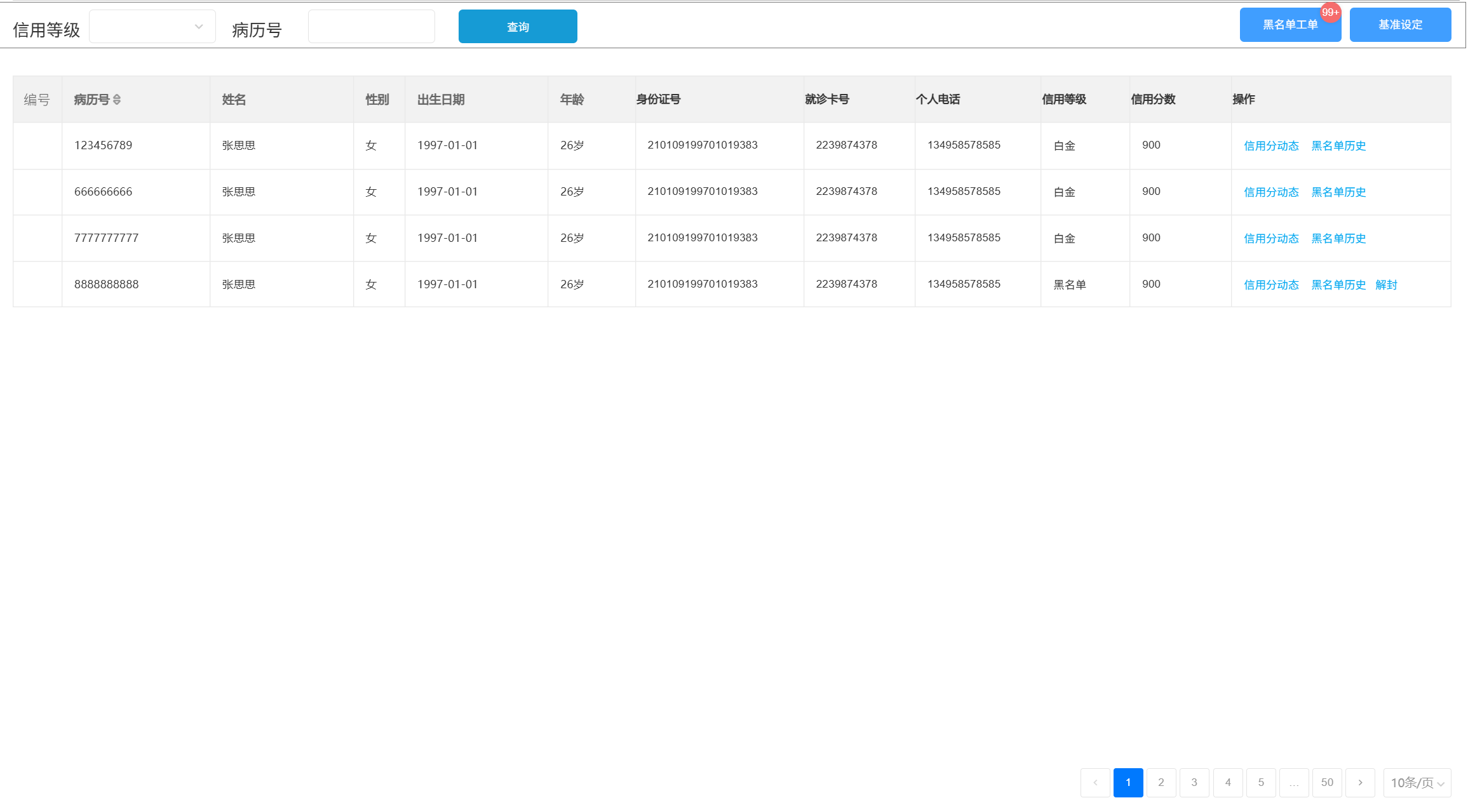 支持管理者通过病历号、身份证号、就诊卡号等关键信息,精准查询患者的信用信息,包括信用等级、信用分数,并可查看患者的信用分动态变化、黑名单历史等详情,实现患者信用状态的一站式掌握。