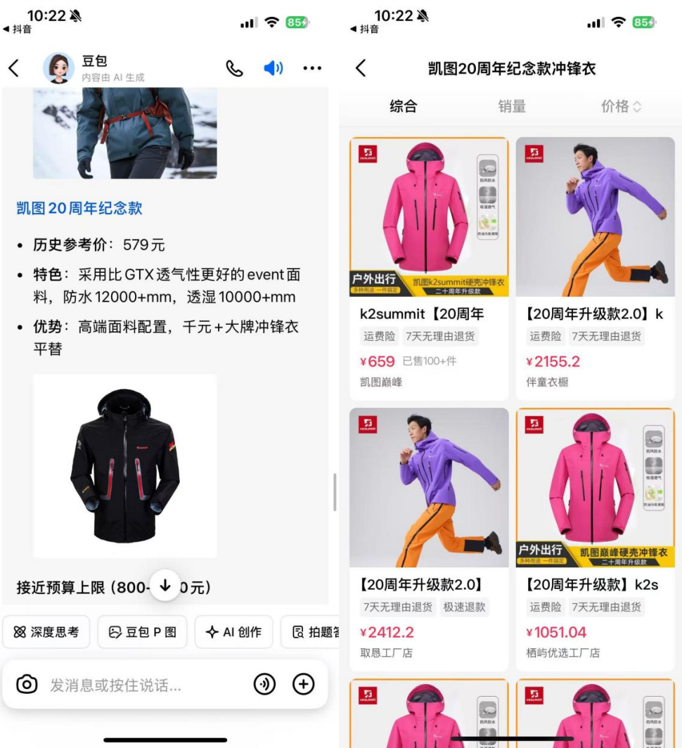 当用户提出消费相关问题,系统不再仅提供模糊建议,而是会直接列出商品卡片,并通过蓝色链接跳转至抖音商城。