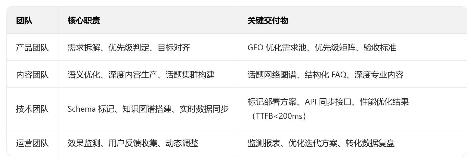GEO 优化需内容、技术、运营团队协同,产品经理作为核心协调者,需明确各团队职责与协作流程。