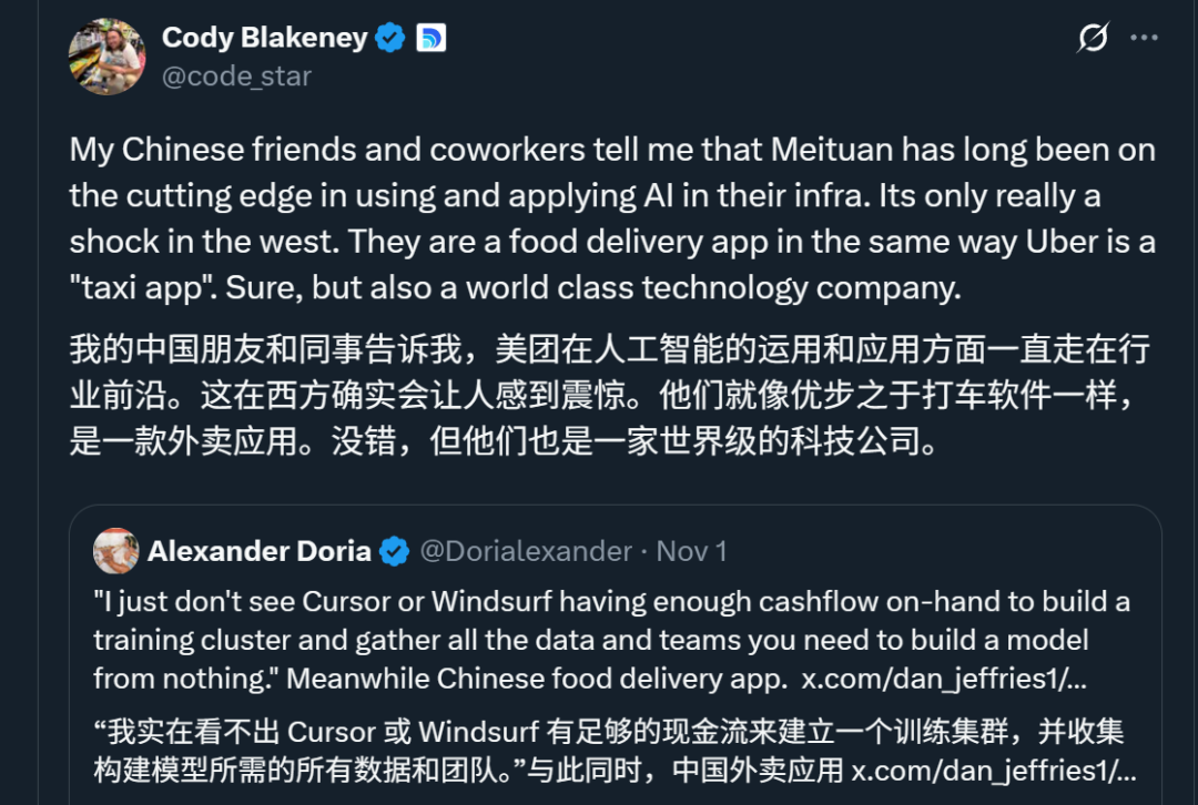 以及有意思的是,美团发布这一成果时恰逢“Cursor‘自研’模型套壳国产开源”的八卦发酵之际,因此美团AI实力被低估的看法正在受到热议。(网友os:看看人家外卖公司,对比过于惨烈~)