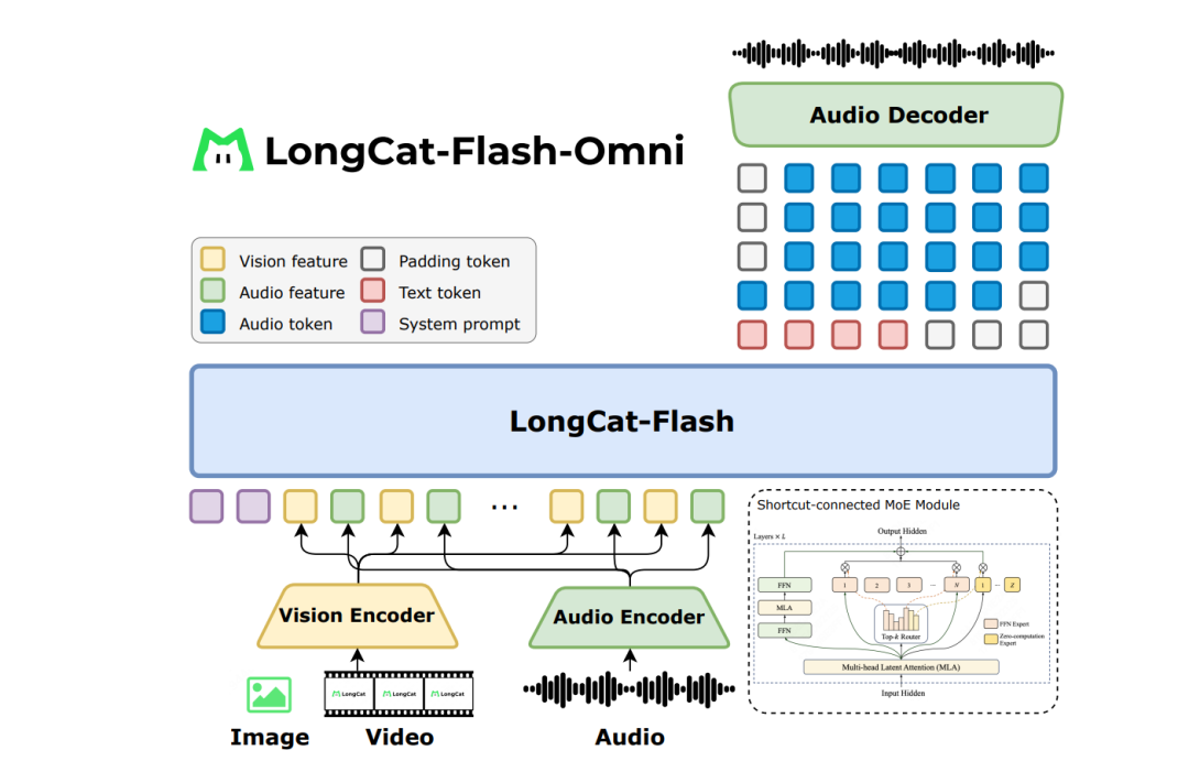 主干部分延续LongCat系列的高效架构设计,采用完全端到端的统一架构ScMoE,能够同时接收文本、音频、图像、视频及任意组合的多模态输入。
