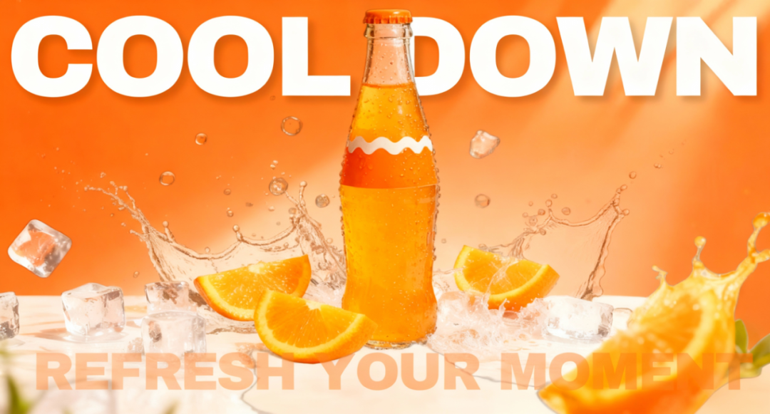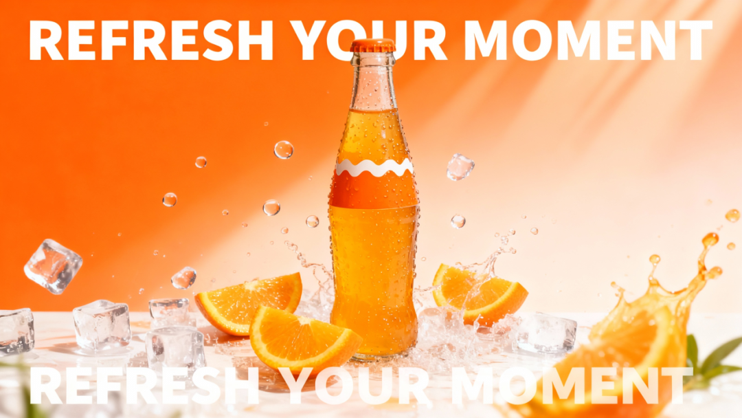 提示语: 给这瓶汽水设计一张海报,给人一种可口美味的感觉,海报中增加一句英文标语,海报比例16:9