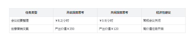 对于创意营销文案这类高价值任务,开启深度思考能带来更高的产出价值(¥350),相比关闭时的¥120有明显提升。因此,从经济角度考虑,对于低价值、常规性的任务,可以选择关闭深度思考以节省资源;而对于高价值、需要精细打磨的任务,则应开启深度思考以追求更高的产出。