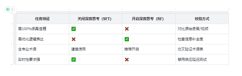上表从“是否需要绝对保真”和“是否需要优化表达”两个维度,以及是否涉及专业术语和实时性要求,给出了在不同情况下应选择开启或关闭深度思考功能的建议。同时,针对每个建议,我们提供了相应的校验方式,以确保决策的科学性。