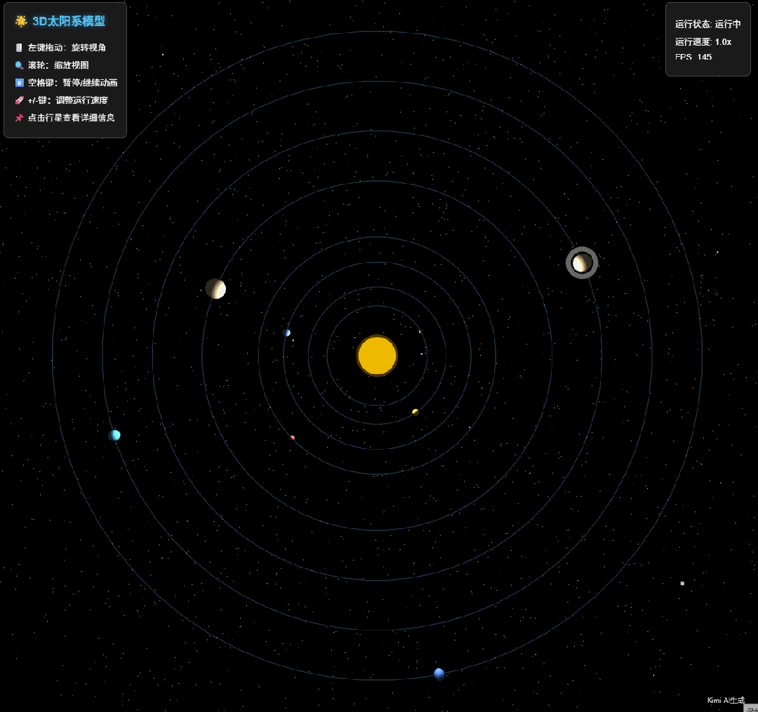 比如,这个简单的Prompt:用Three.js构建可交互3D太阳系,需实现行星自转、公转、轨道倾角等功能。