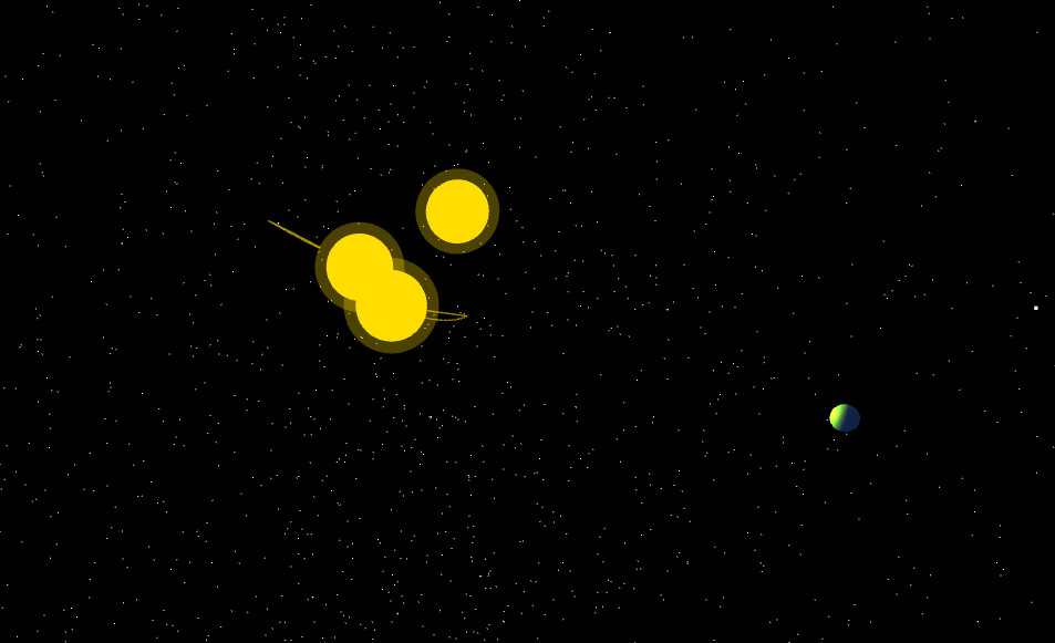 根据《三体》小说的背景,用Three.js构建一个3D的三体星系(有3颗太阳,质量、颜色一致),模拟三体系统的混沌特性,需实现自转、公转、轨道倾角等功能。