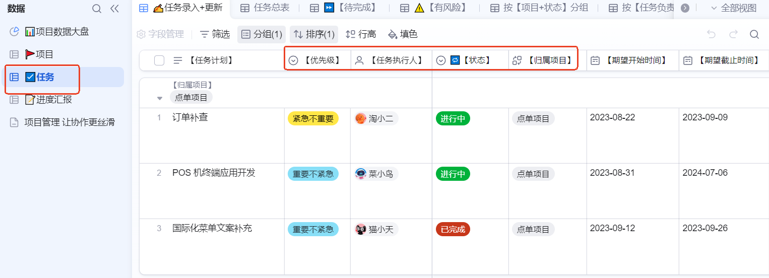 “当进度百分比被修改为100%时,自动将任务状态更改为‘已完成’,并记录实际完成日为当天。”简化操作,确保数据规范,同时这种自动化的状态管理确保了项目数据的实时准确性。