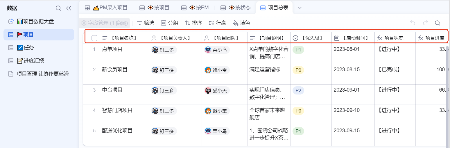 在钉钉工作台里,我们可以创建项目的钉钉AI表格,通过设计核心字段创建项目专属的智能追踪表,明确项目名称、项目负责人,项目优先级,协同部门,项目状态,项目进度,让各协同方都能清晰的知道进度,这样我们就通过钉钉AI表格创建了一个动态的、结构化的项目追踪系统,所有信息一目了然,井井有条。