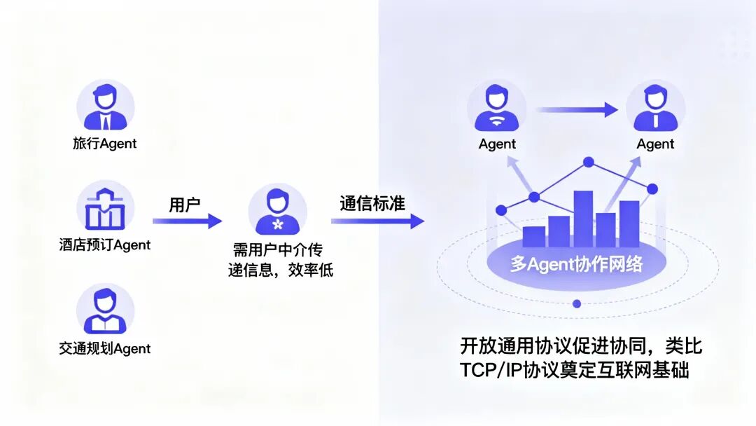 想象一下,如果你的”旅行Agent”不能和”酒店预订Agent”或”交通规划Agent”直接通信,而是需要通过你作为中介来传递信息,那效率就会大打折扣。这种标准缺失严重制约了Agent生态的扩张