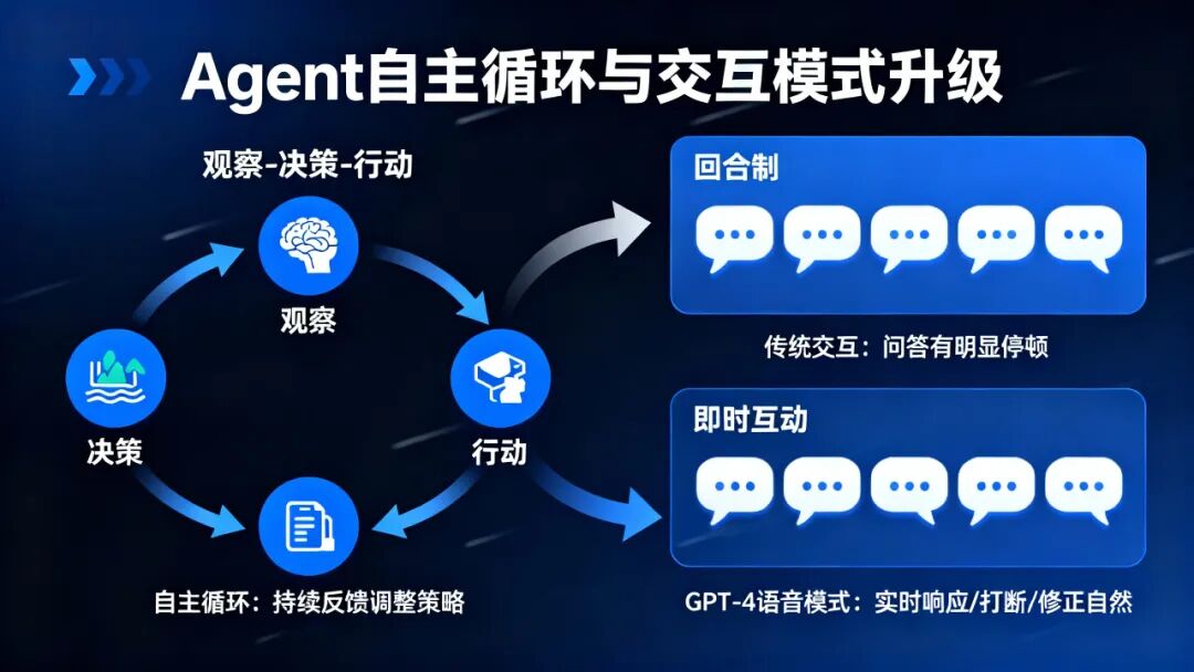 交互模式也从”回合制”升级到了”即时互动”。以前我们和AI的交互更像是发邮件,你问一句,它答一句,中间有明显的停顿。现在呢?看看GPT-4的语音模式,几乎可以实现像真人对话一样的实时响应,打断、插话、修正都变得自然流畅