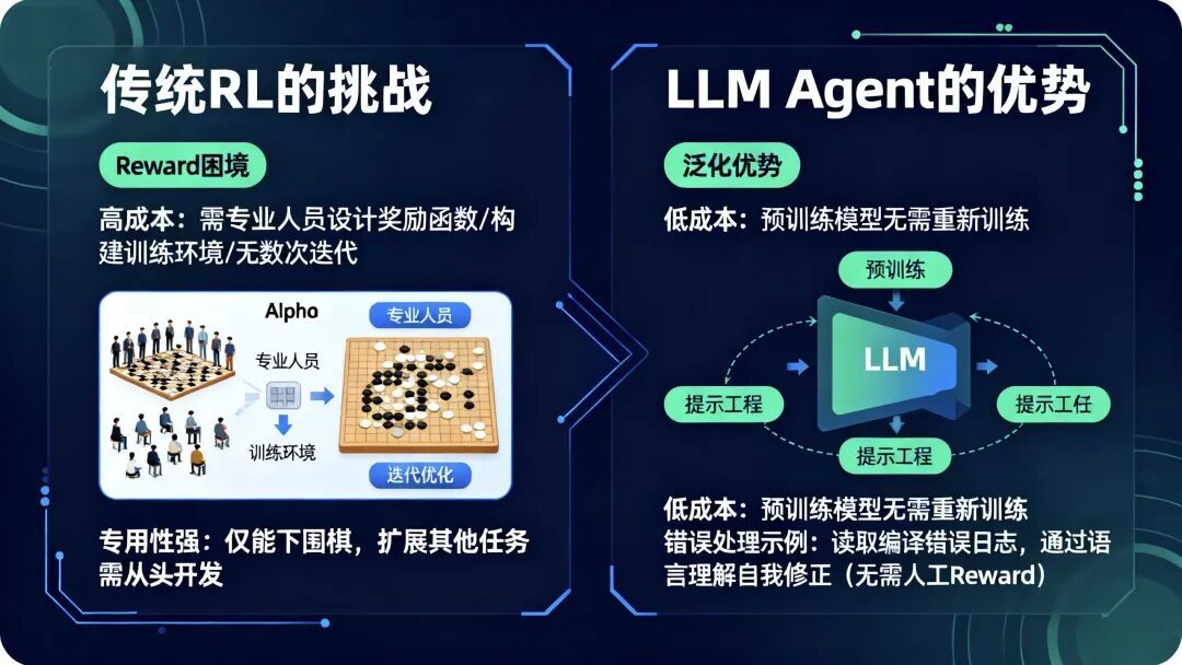 最直观的例子就是错误处理。传统RL系统需要人工设计Reward信号来告诉AI什么是对的、什么是错的。而LLM Agent可以直接读取编译错误日志,理解错误信息,然后尝试修改代码。它不需要依赖人工定义的Reward,而是通过语言理解来自我修正