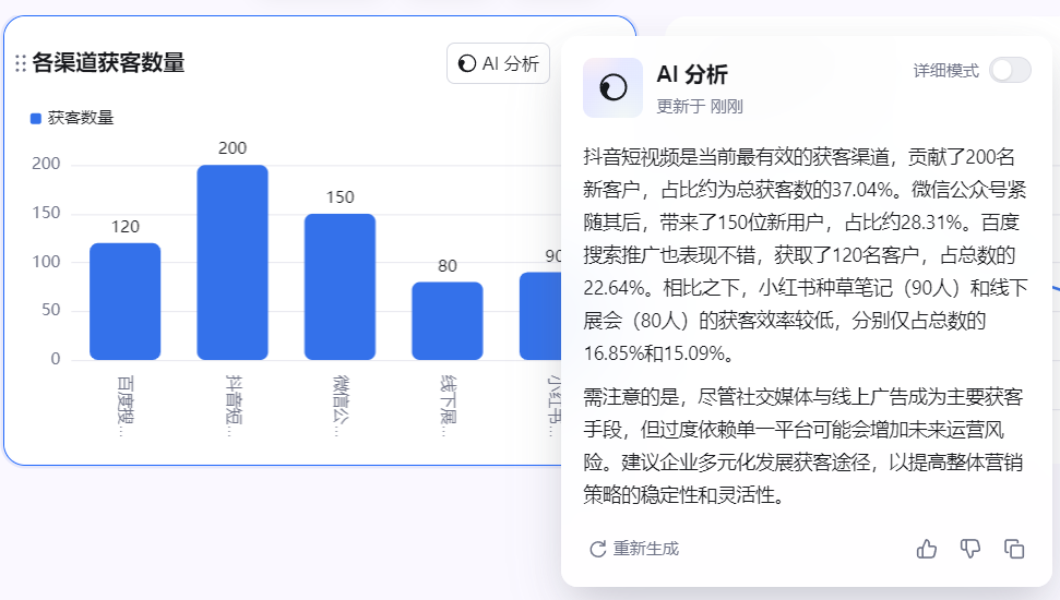 用钉钉AI表格的第一周,我彻底摆脱了公式噩梦。录完数据(其实是同事们在群里实时填的,抖音运营填抖音的数据,公众号小编填公众号的,谁负责的渠道谁填,不用我一个个收表汇总了),点了下顶部的“AI 分析”,选了“渠道效果对比”。几秒钟后,表格底下弹出一大段分析文字,还附了两个自动生成的图表。