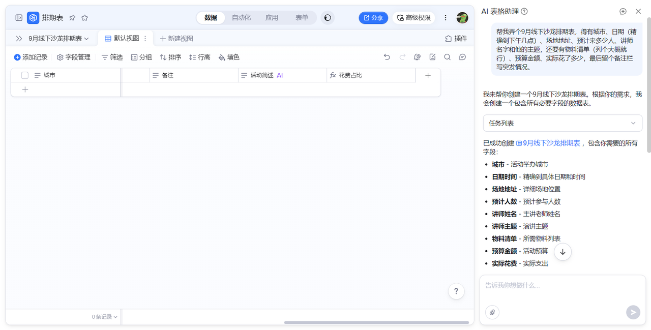 我半信半疑点开空白表格,点了下那个“AI 生成”的小图标,在对话框里敲:“帮我弄个9月线下沙龙排期表,得有城市、日期(精确到下午几点)、场地地址、预计来多少人、讲师名字和他的主题,还要有物料清单(列个大概就行)、预算金额、实际花了多少,最后留个备注栏写突发情况。”