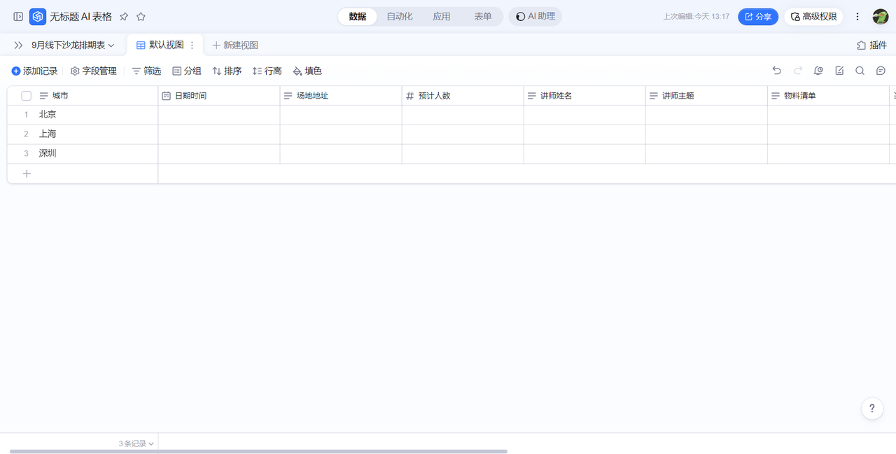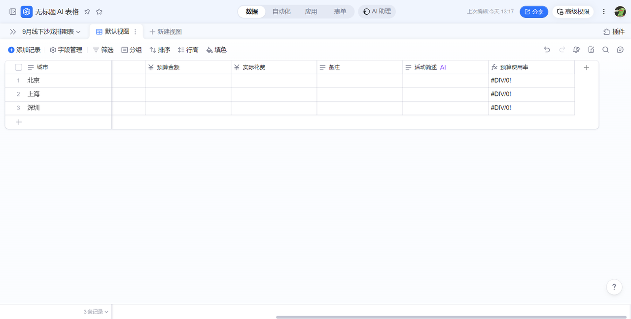 以前做季度活动计划表,光是确定列名就能耗掉半小时。就拿“3 月线下沙龙排期表”来说,得琢磨清楚:城市、日期、场地、预计人数、讲师、物料清单、预算、实际花费、报名链接…… 少一列后期就得补,多一列又显得冗余。