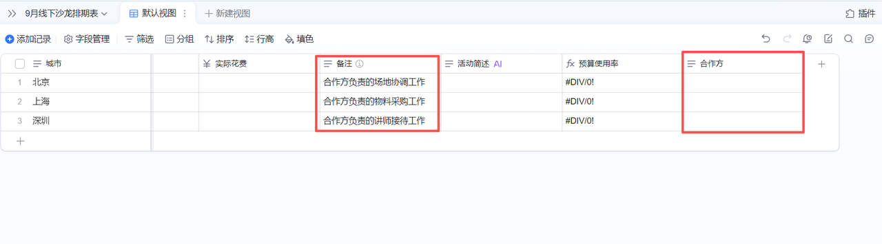 更惊喜的是改表的时候。我发现忘了加“合作方”信息,直接在对话框补了句“再加个合作方列,备注里写清楚他们负责啥”,表格秒加新列,备注栏的示例文字还自动改成了“合作方负责场地布置 / 设备调试”。