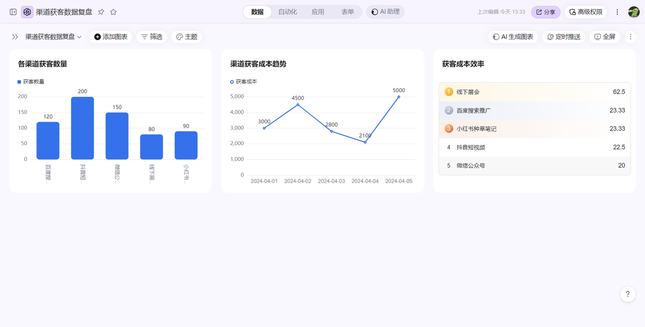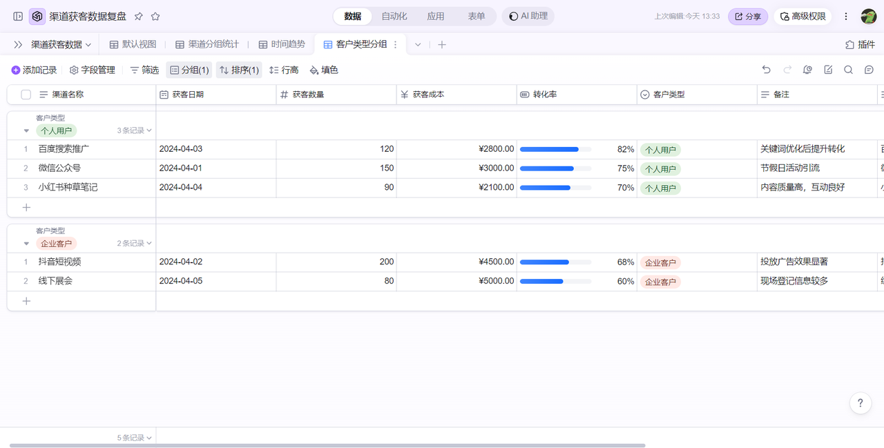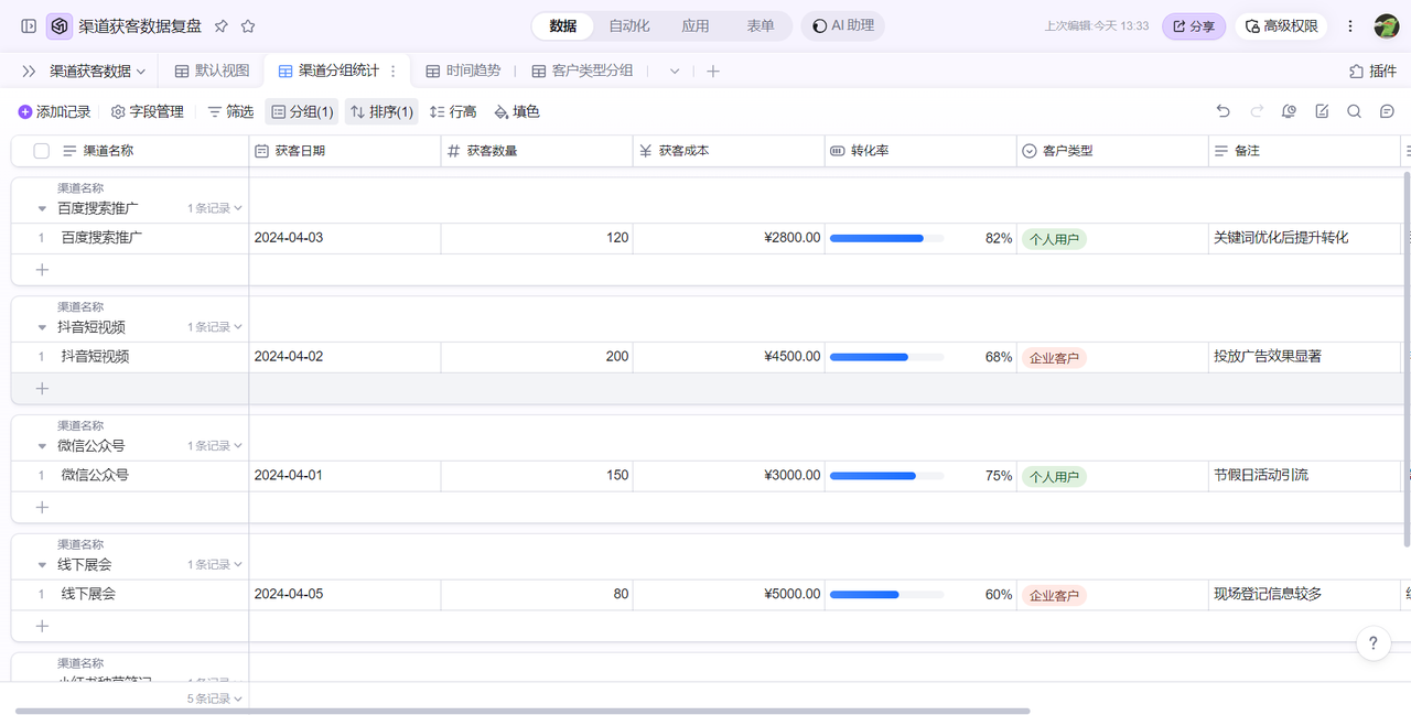 部门每周一要做“渠道获客数据复盘”,说白了就是把抖音、小红书、公众号这几个渠道的曝光、点击、报名数据汇总,算转化率,最后给领导一个“下周重点投哪个”的结论。以前这活儿从上午9点干到11点,一半时间耗在公式上,另一半耗在找数据规律上。