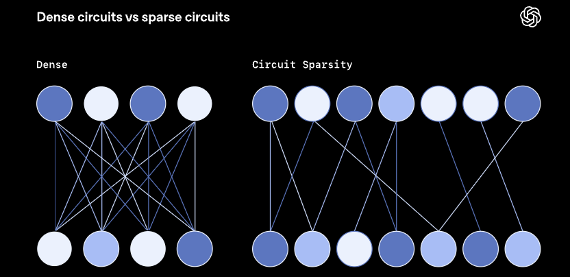 右边Circuit Sparsity(稀疏电路),显示的是在稀疏模型里,每个神经元只会与下一层中的少数几个神经元相连。