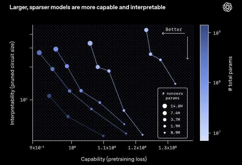 对于固定规模的稀疏模型来说,提高稀疏度,即把更多权重设为零,这会降低模型能力,但会提升可解释性。