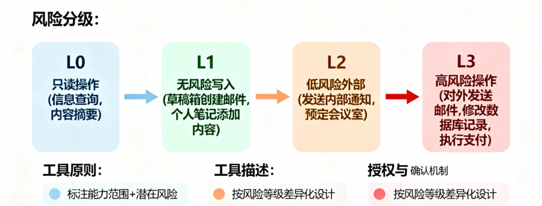 作为产品经理,我们首先要做的就是明确划定Agent的行动权限清单。什么是它能做的,比如查询数据、生成草稿;什么是它绝对不能做的,比如自动支付、删除数据、修改系统设置。这个清单不能模糊,必须像交通规则一样清晰。我们团队在设计工具调用时,会在每个工具描述里明确标注能力范围和潜在风险,就像药品说明书一样。这个过程需要进行细致的“风险分级”。我们可以将Agent能够执行的动作分为几个等级:L0(只读操作),如信息查询、内容摘要;L1(无风险写入操作),如在草稿箱中创建邮件、在个人笔记中添加内容;L2(低风险外部操作),如发送内部通知、预定会议室;L3(高风险操作),如对外发送邮件、修改数据库记录、执行支付。对于不同等级的操作,产品需要设计不同的授权和确认机制。这种基于风险的权限管理体系,是构建安全护栏的第一道防线。