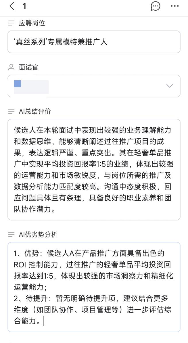 现在,通过AI表格的智能招聘系统,我只需输入应聘者的面试记录以及我们的岗位要求,系统一分钟内就能附上详细的评估报告供我参考:“候选人A过往推广的轻奢单品平均投资回报率达到1:5;候选人B的短视频作品在目标客群中的完播率超过行业均值40%;候选人C拥有海外时尚背景,其内容质感与品牌高端线高度契合。”这种基于多维度数据的精准画像,让我能像资深星探一样做出录用决策。最终招聘的博主在首个月推广中就带来超过预期的曝光量,人岗匹配效率提升50%。