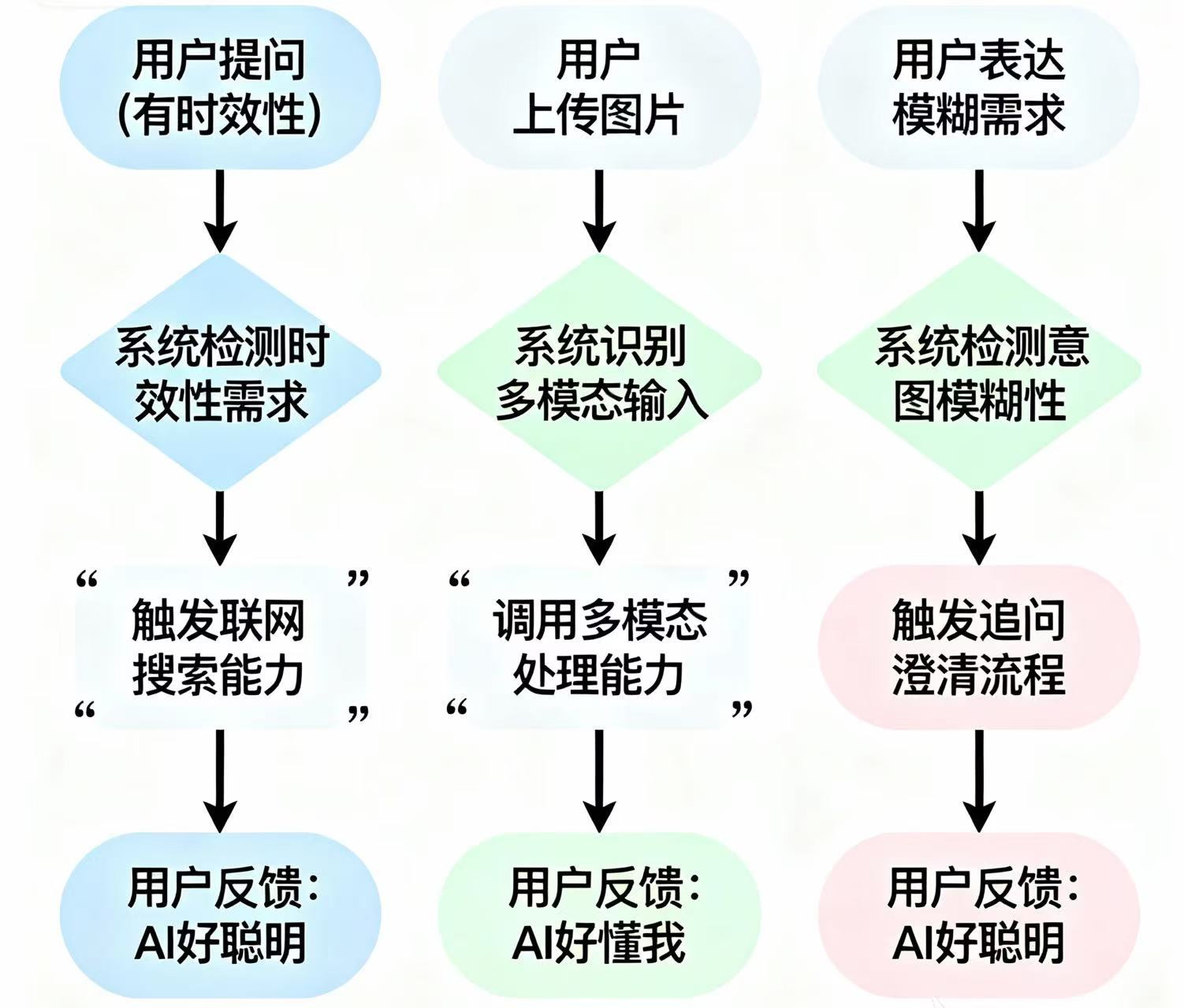 而千问APP要做的,就是通过大量的系统级Prompt优化和产品化封装,把这个“裸模”变成一个用户拎包入住的“精装房”。比如,当用户问一个有时效性的问题时,系统会自动触发联网搜索能力;当用户上传一张图片时,系统会自动识别并调用多模态能力;当用户表达一个模糊的需求时,系统会通过追问来澄清意图。所有这些,用户是无感的,他只是觉得“这个AI好聪明,好懂我”