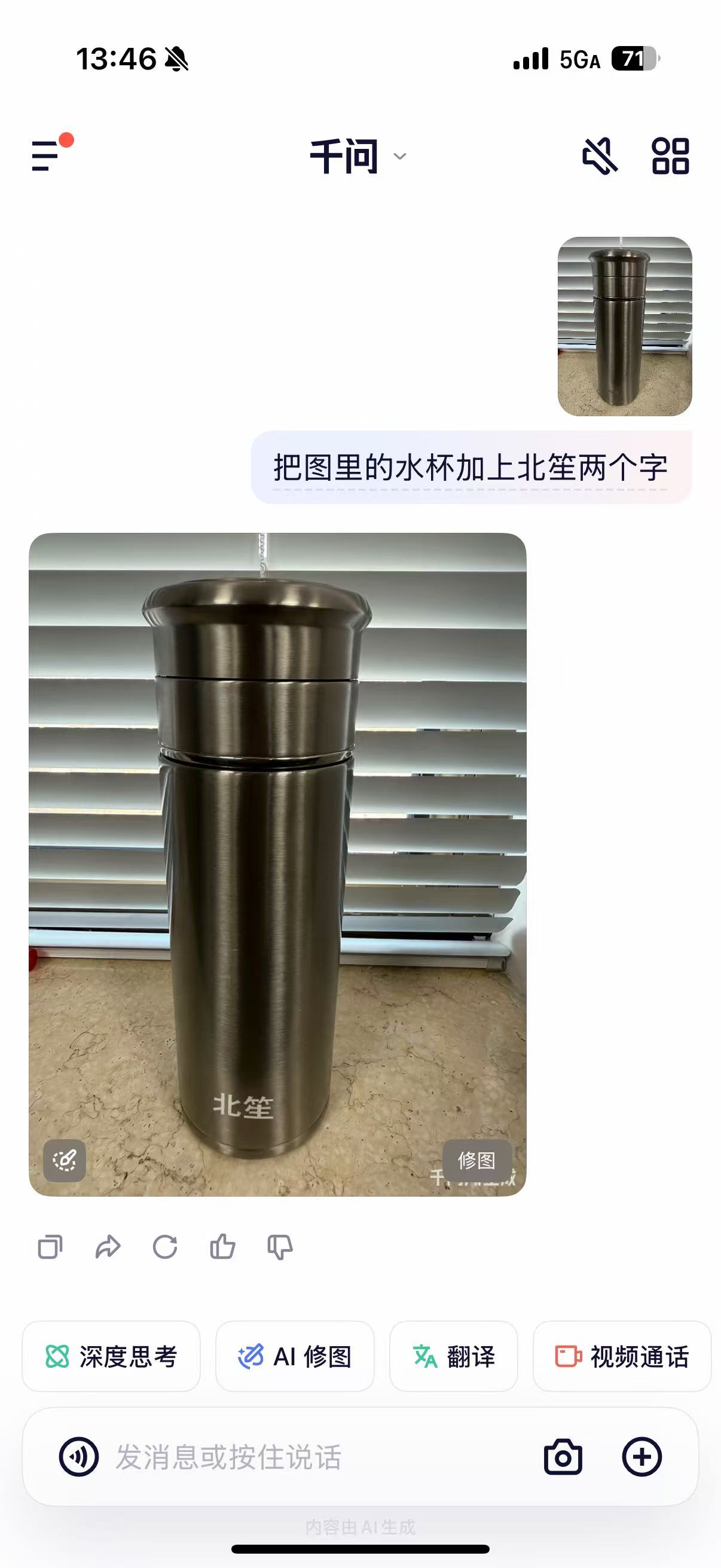就拿图片编辑来说。以前,你想把一张照片里的某个物体换掉,比如把一瓶可乐换成一瓶矿泉水,那得动用Photoshop这种专业软件,又是抠图又是蒙版,没几个小时搞不定。现在,在千问里,你只需要上传图片,然后说一句:“把图里的水杯加上北笙两个字”。几秒钟后,一张毫无违和感的新图片就生成了。这种体验,对于不懂PS的普通人来说,简直就是魔法
